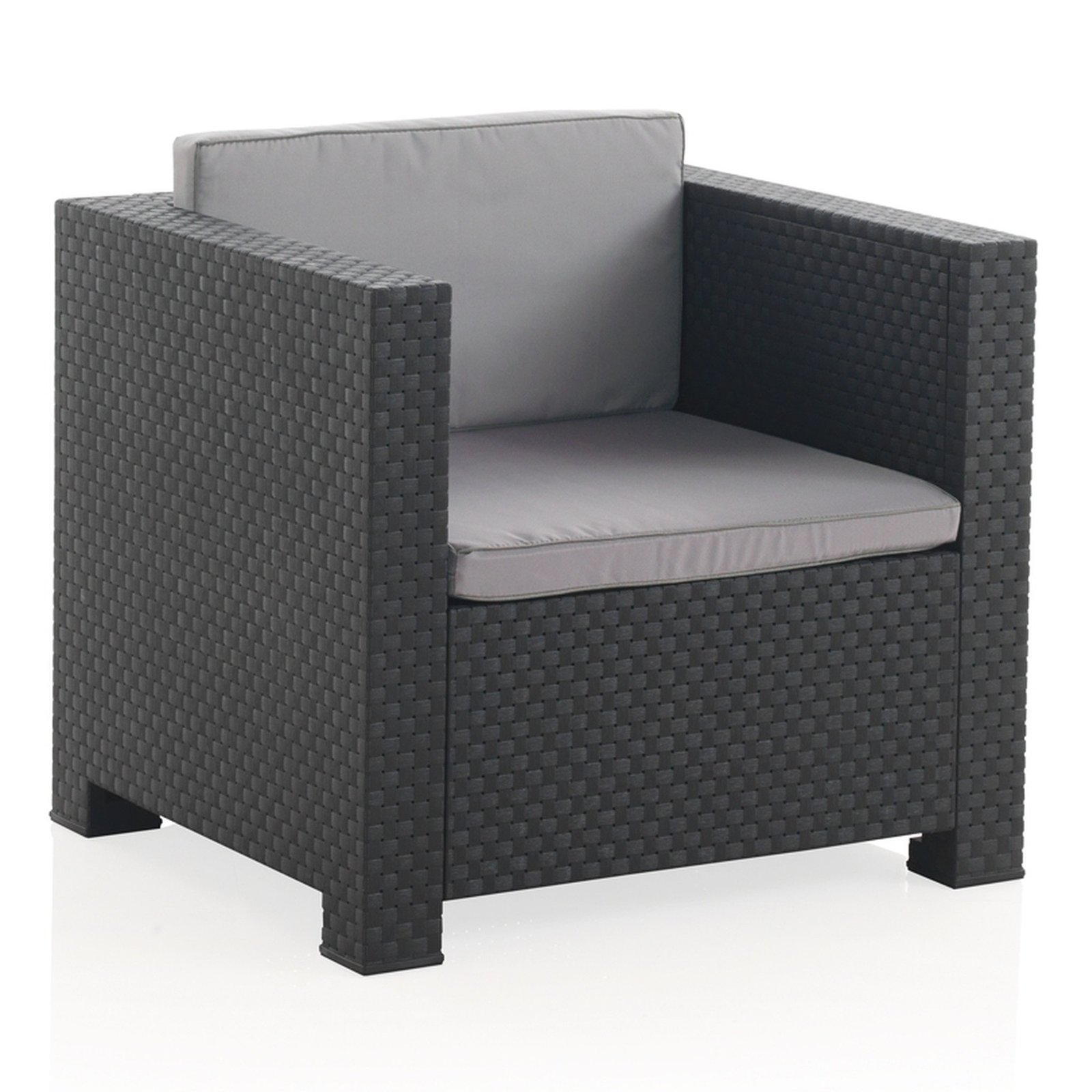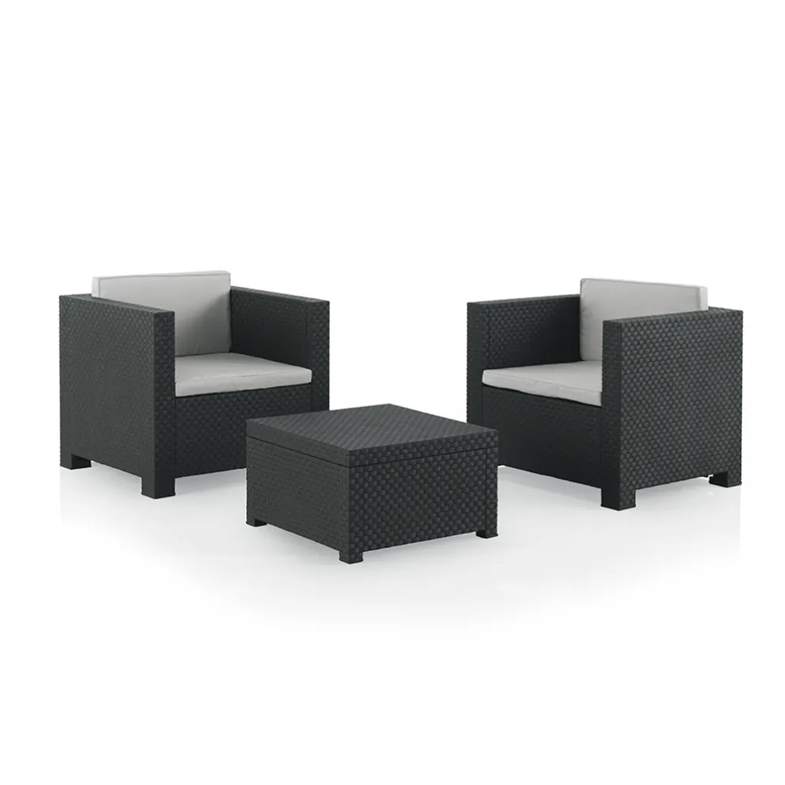 Hecho de plástico reciclado de alta calidad sin componentes metálicos para evitar la oxidación, en un elegante color grafito con una textura que imita el trenzado de ratán, este set para dos personas incluye dos sillones individuales (74cm x 66cm x 72cm), cojines de asiento y respaldo acolchados, y una mesa baja de centro (57cm x 57cm x 34cm).