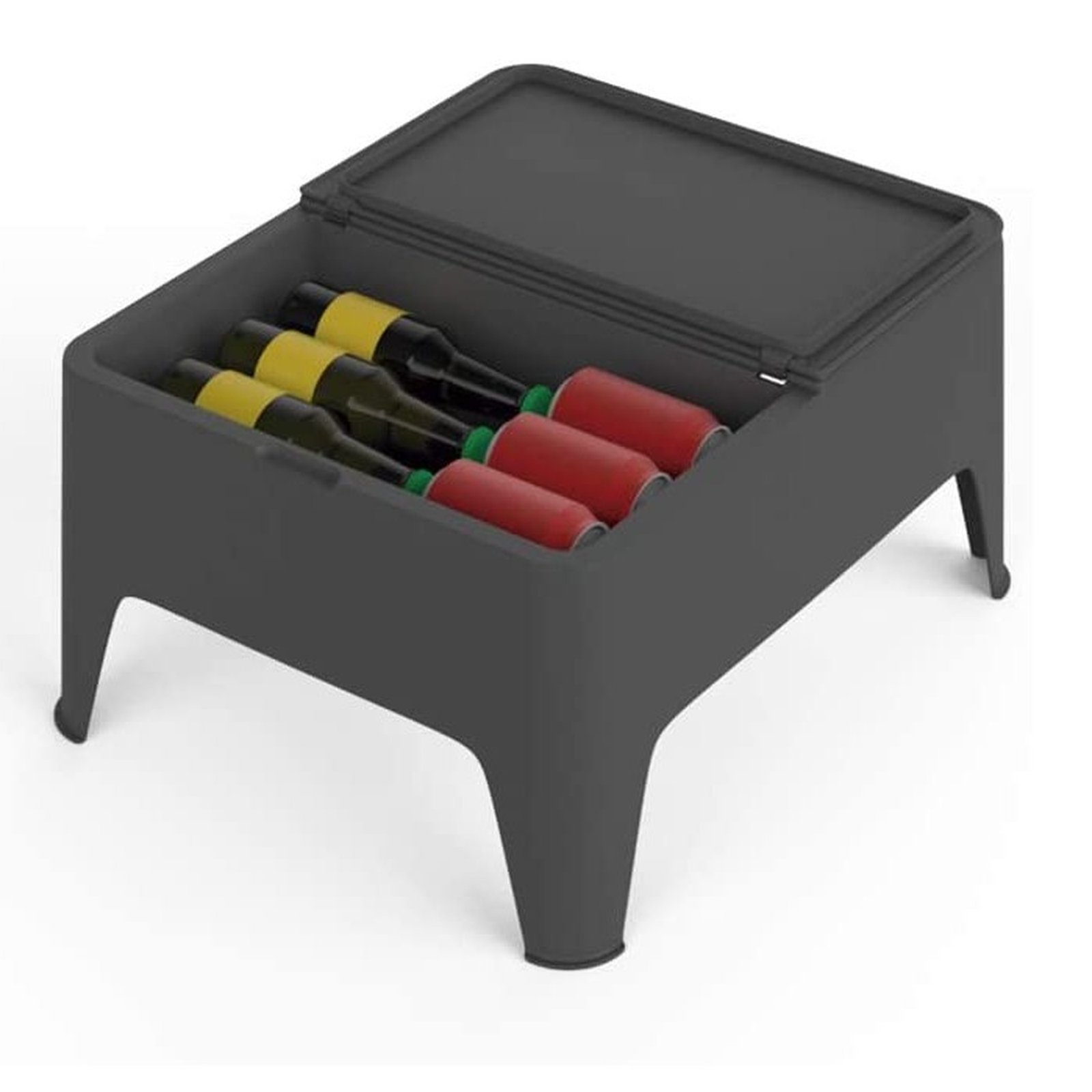 Como se puede observar, cumple una doble función: apoyar en ella tus objetos, bebida, comida, etc.; y, en segundo lugar, poder guardar dentro de ella de forma muy sencilla estos mismos objetos o alimentos. Entre sus ventajas destacan también que es una mesa para terraza apilable, ligera y resistente a los rayos solares UV.