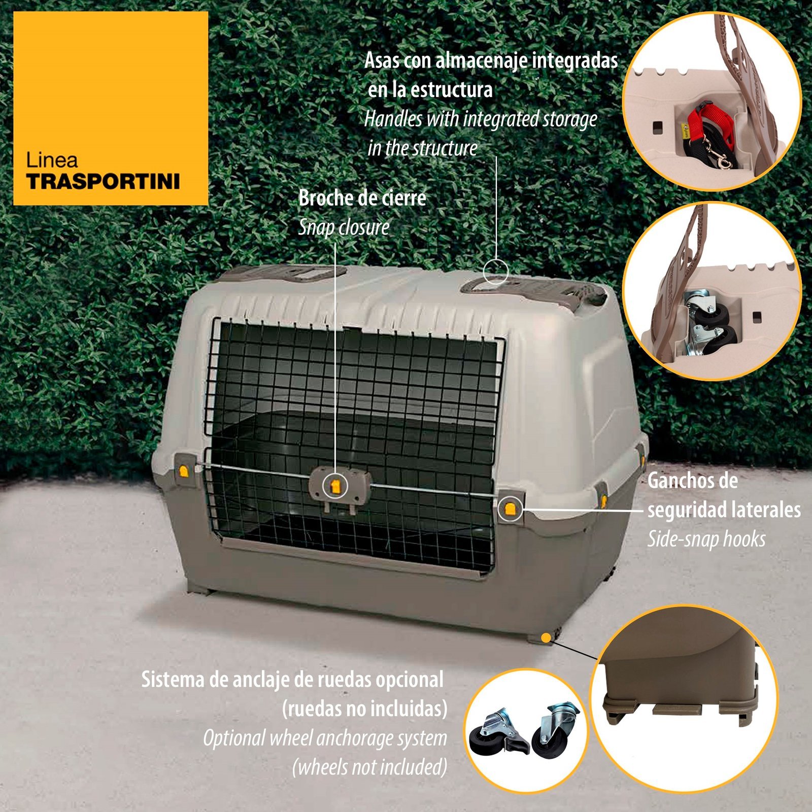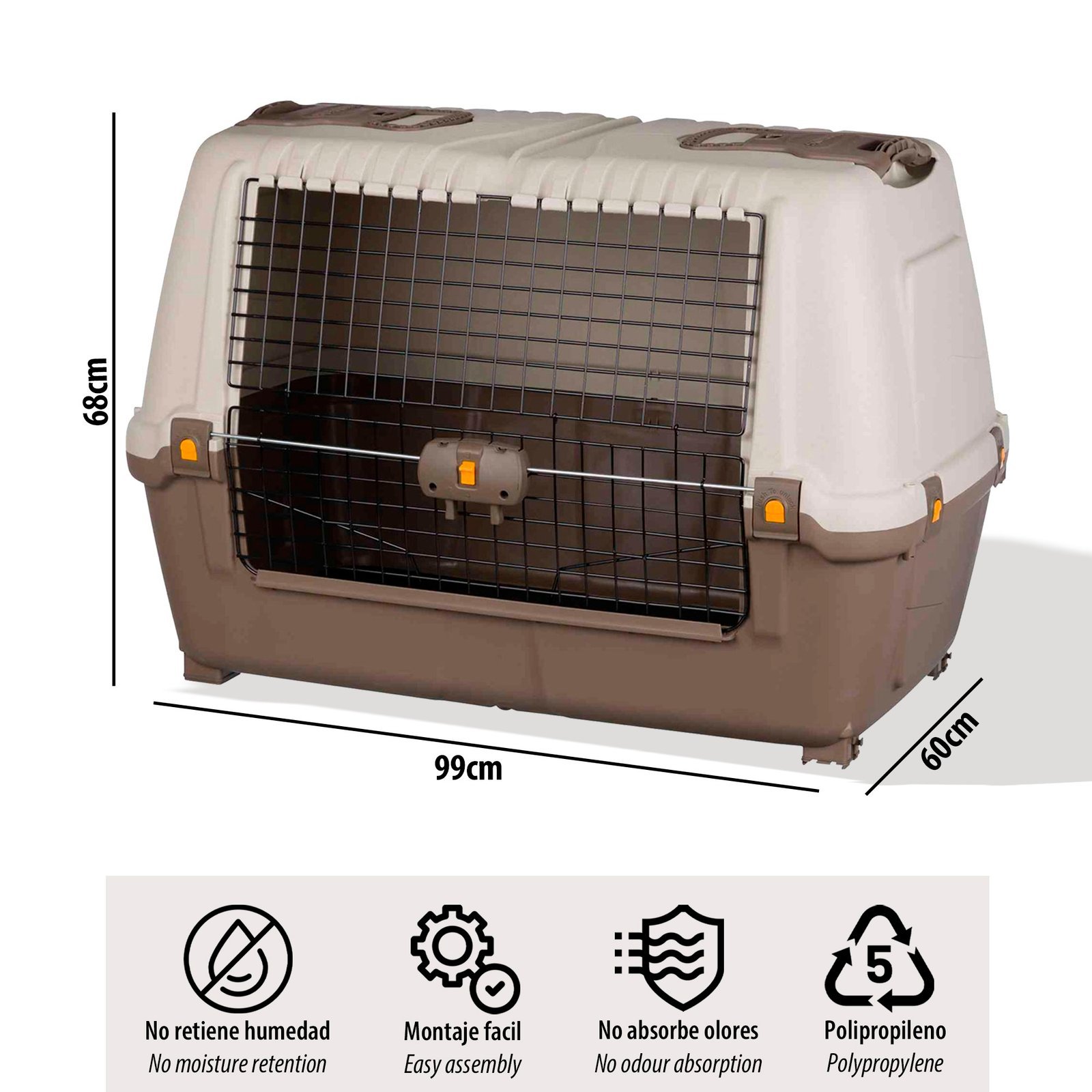 El transportÃn perfecto para tu mascota: de diseño tradicional, y muy práctico. Fabricado en polipropileno plástico, no absorbe olores, no retiene la humedad, y es de fácil montaje. Dimensiones: 99 x60 x alto 68 cm. Con cierres y ganchos de seguridad laterales. Asas de transporte escamoteables integradas en la estructura